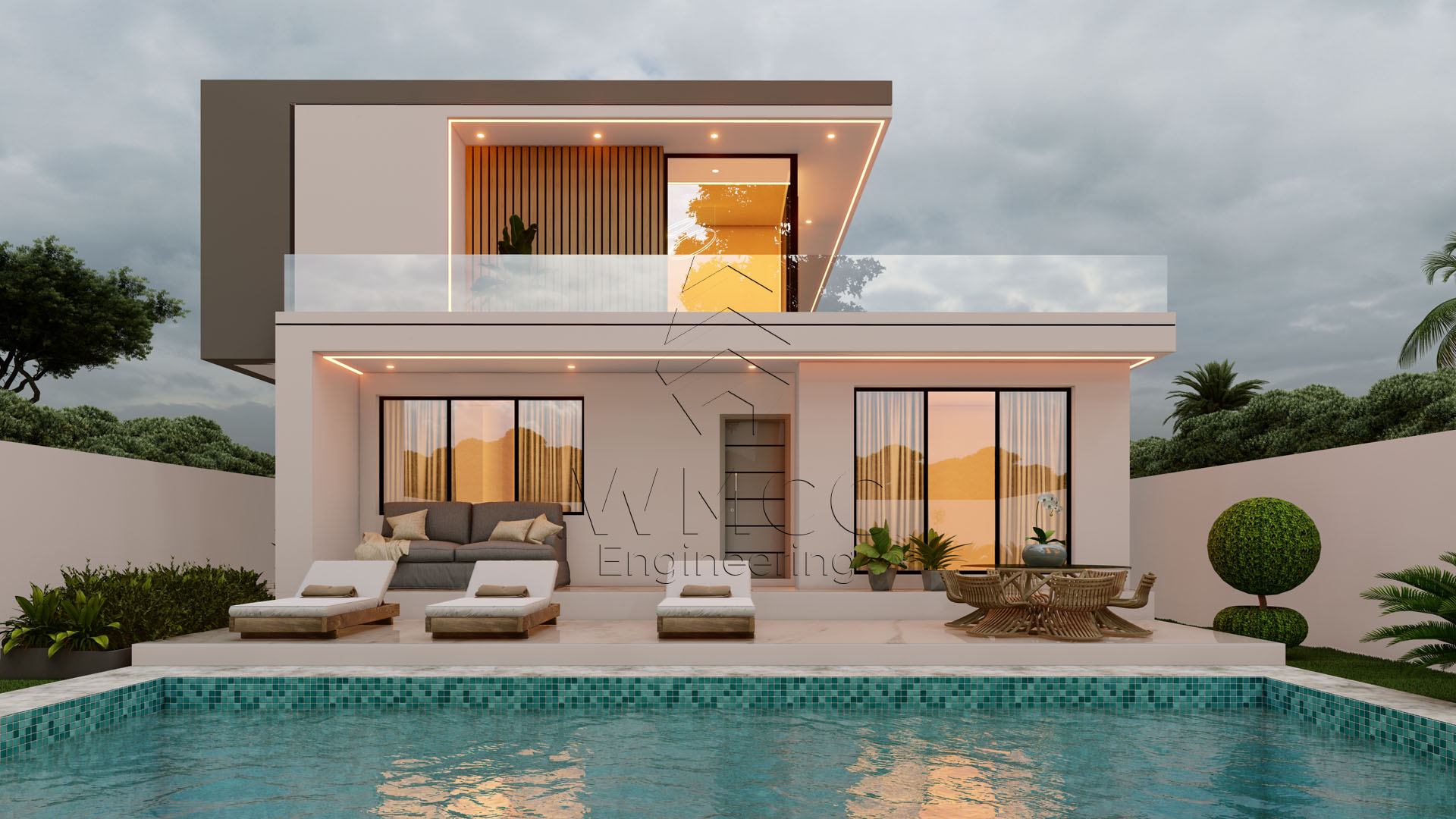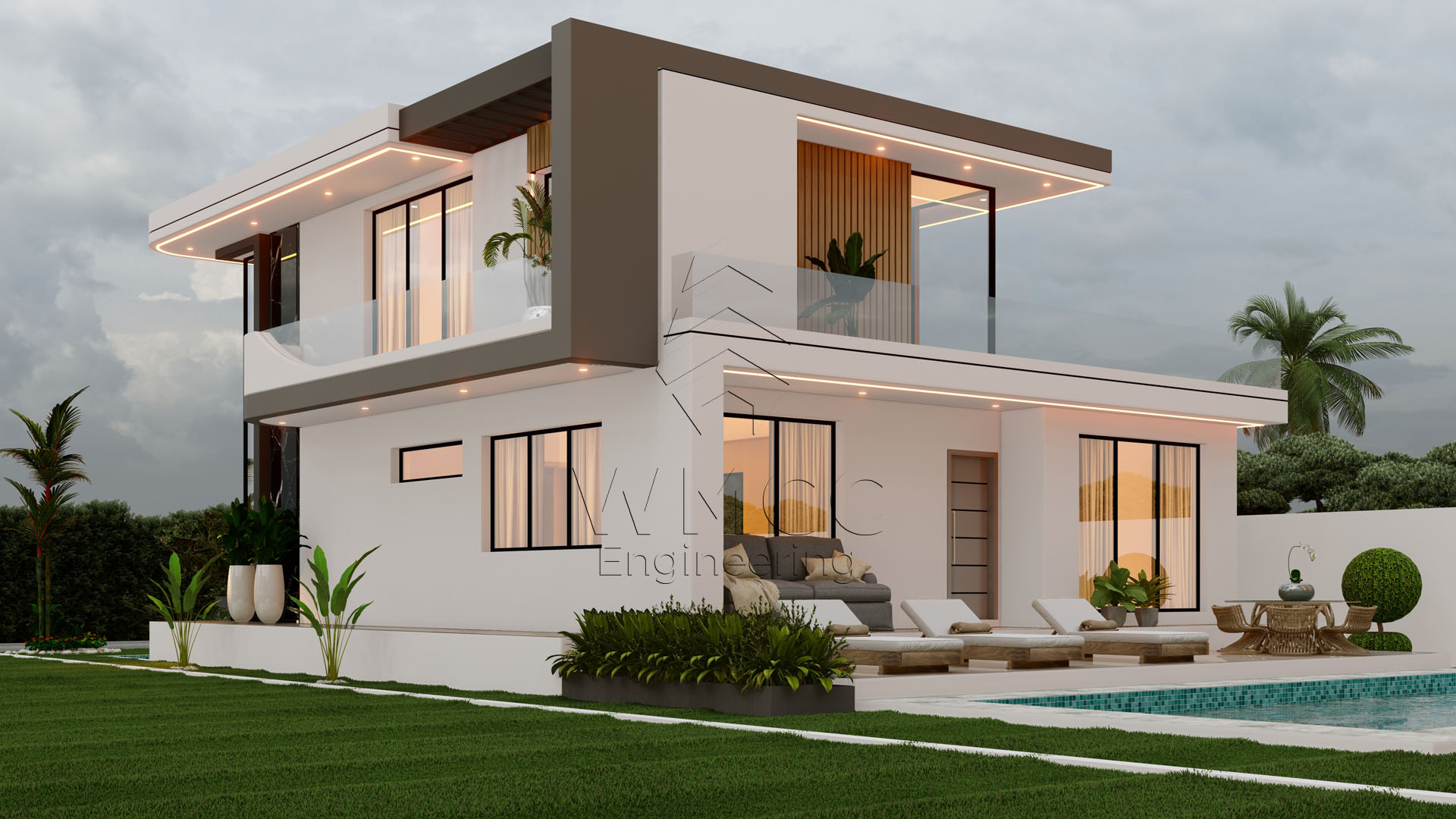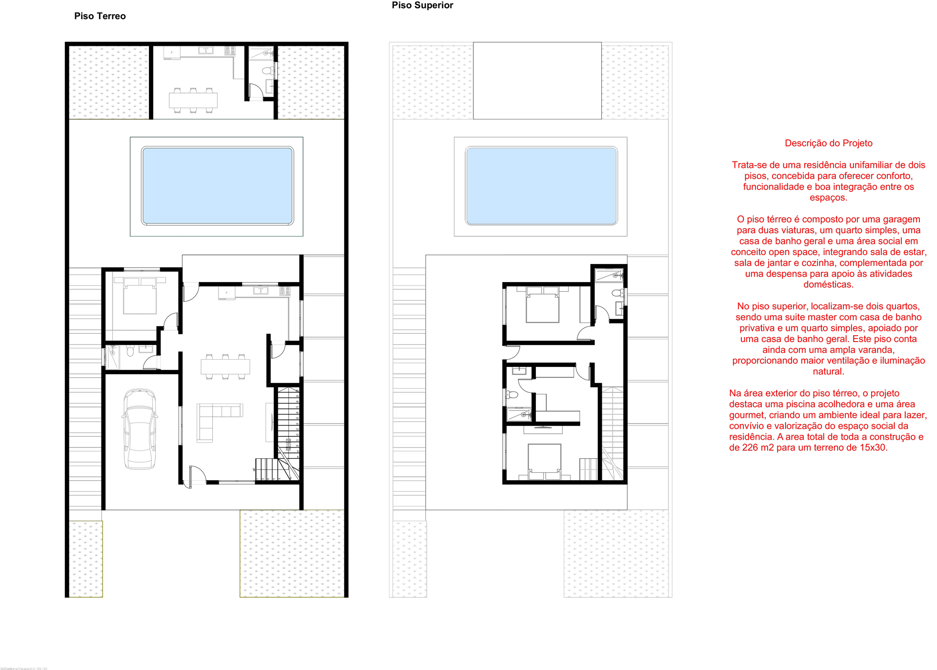 This modern Type 3 residence offers a perfect balance of comfort, functionality, and contemporary design. Spread across two floors, the house is thoughtfully planned to provide efficient use of space and a seamless flow between indoor and outdoor areas. The ground floor features an open-plan living room, dining area, and kitchen, creating a bright and welcoming social space. It also includes a guest bedroom, a shared bathroom, and a garage for two vehicles. On the upper floor, the private area consists of three bedrooms, including a master suite, supported by additional bathroom facilities and a spacious veranda that enhances natural light and ventilation. The outdoor area is designed for relaxation and entertainment, with a swimming pool and a dedicated gourmet space, ideal for family moments and social gatherings. With a total construction area of approximately 226 m², this residence is an excellent choice for families seeking a modern and practical home.
