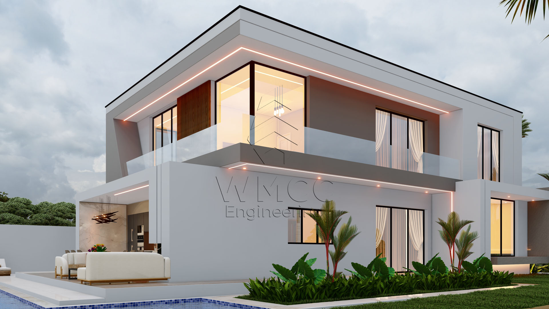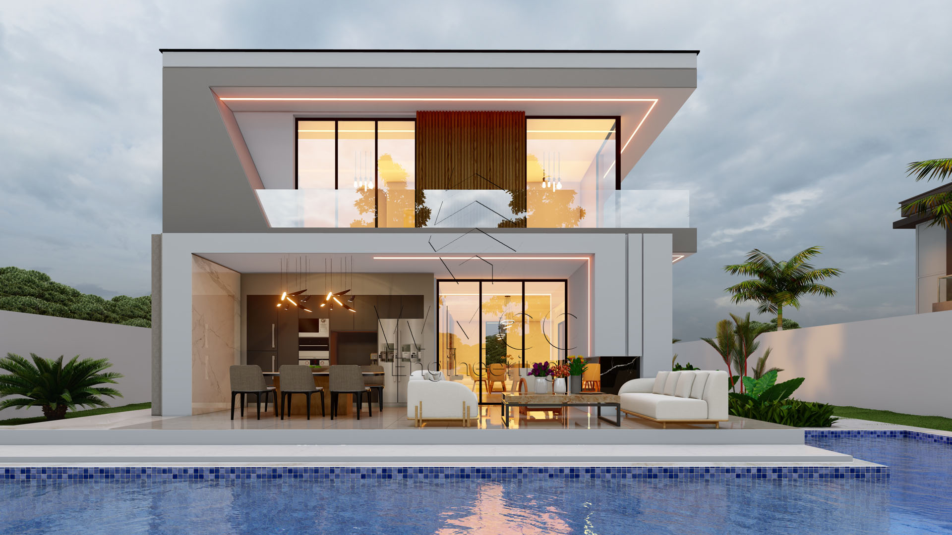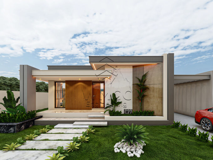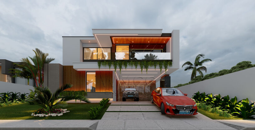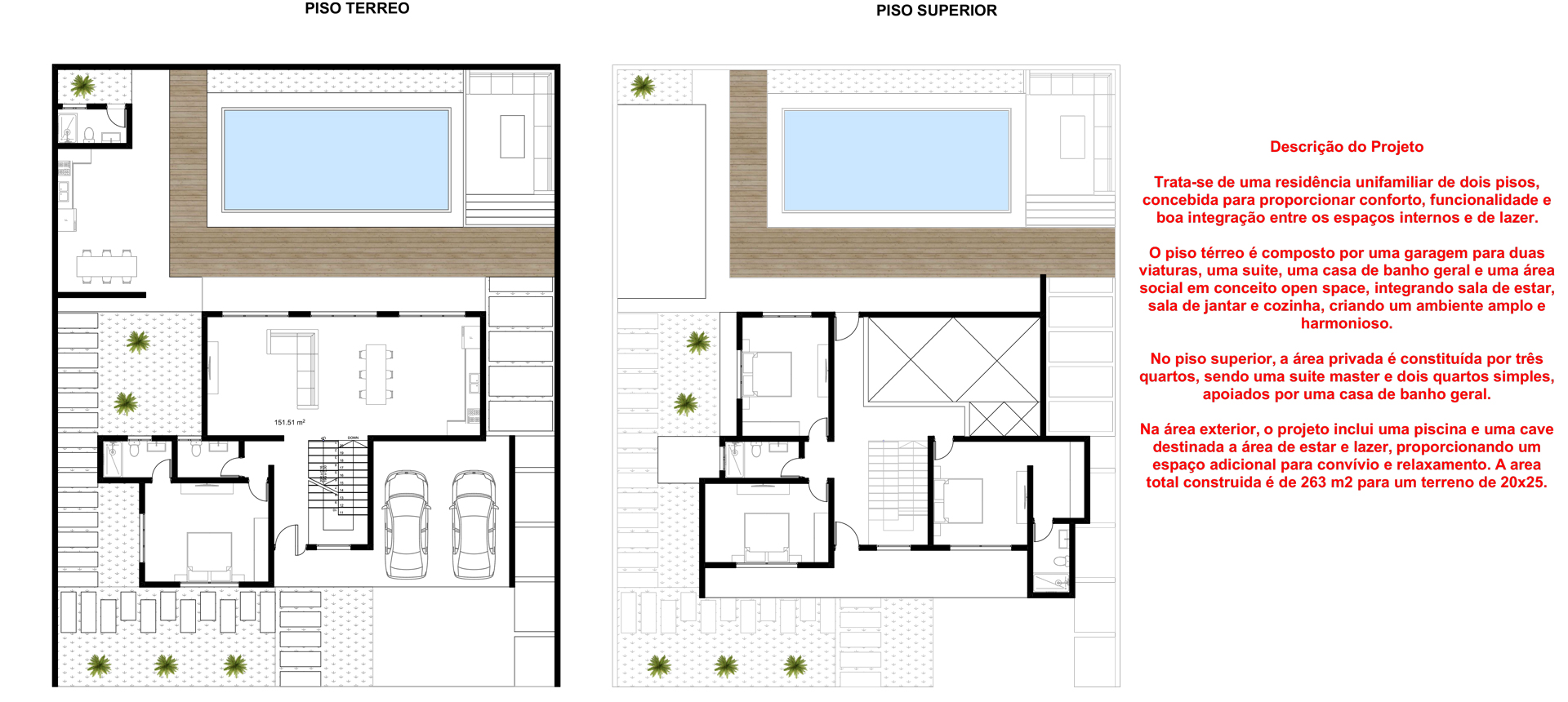 This contemporary Type 4 residence is designed to offer comfort, space, and a seamless connection between indoor and outdoor living. Spread across two floors, the home combines functionality with a refined modern layout, ideal for family living and entertaining. The ground floor features a spacious open-plan living area that integrates the living room, dining space, and kitchen, creating a bright and welcoming environment. It also includes a private suite, a shared bathroom, and a garage for two vehicles, ensuring both convenience and flexibility. Upstairs, the private area consists of four bedrooms, including a master suite, supported by additional bathroom facilities. The layout is designed to maximize privacy while maintaining a sense of openness and comfort. The exterior stands out with a beautifully designed leisure area, featuring a swimming pool and a dedicated lounge space, perfect for relaxation and social gatherings. With a total construction area of approximately 263 m², this residence is an excellent choice for families seeking a modern, spacious, and well-balanced home.