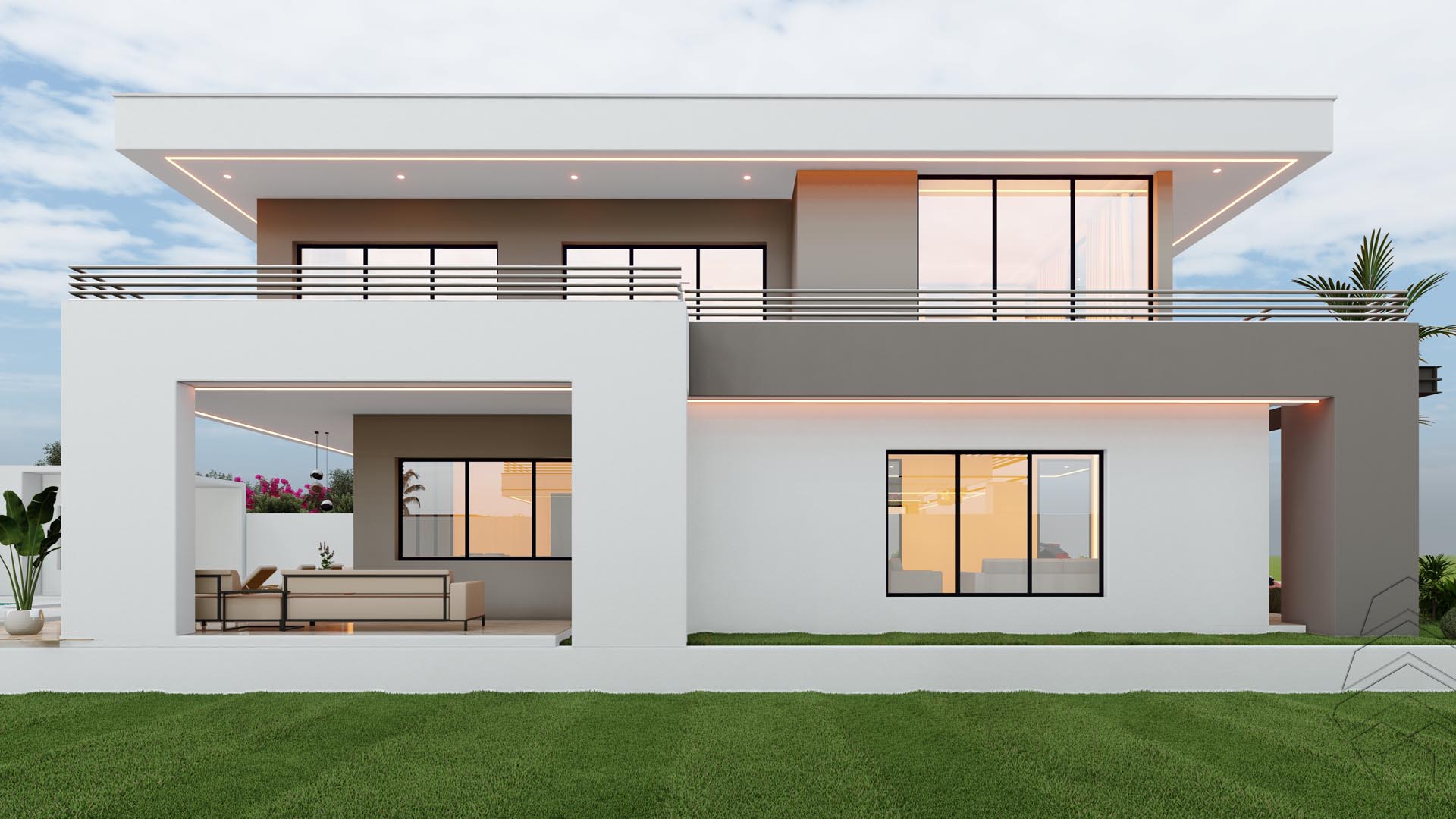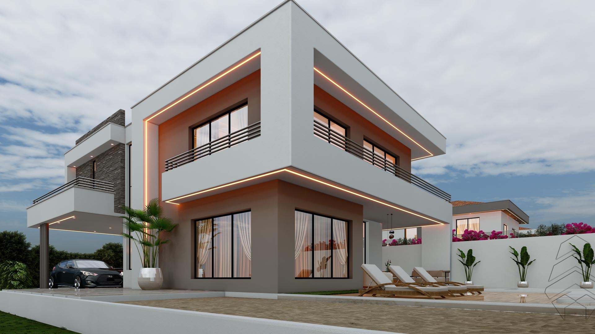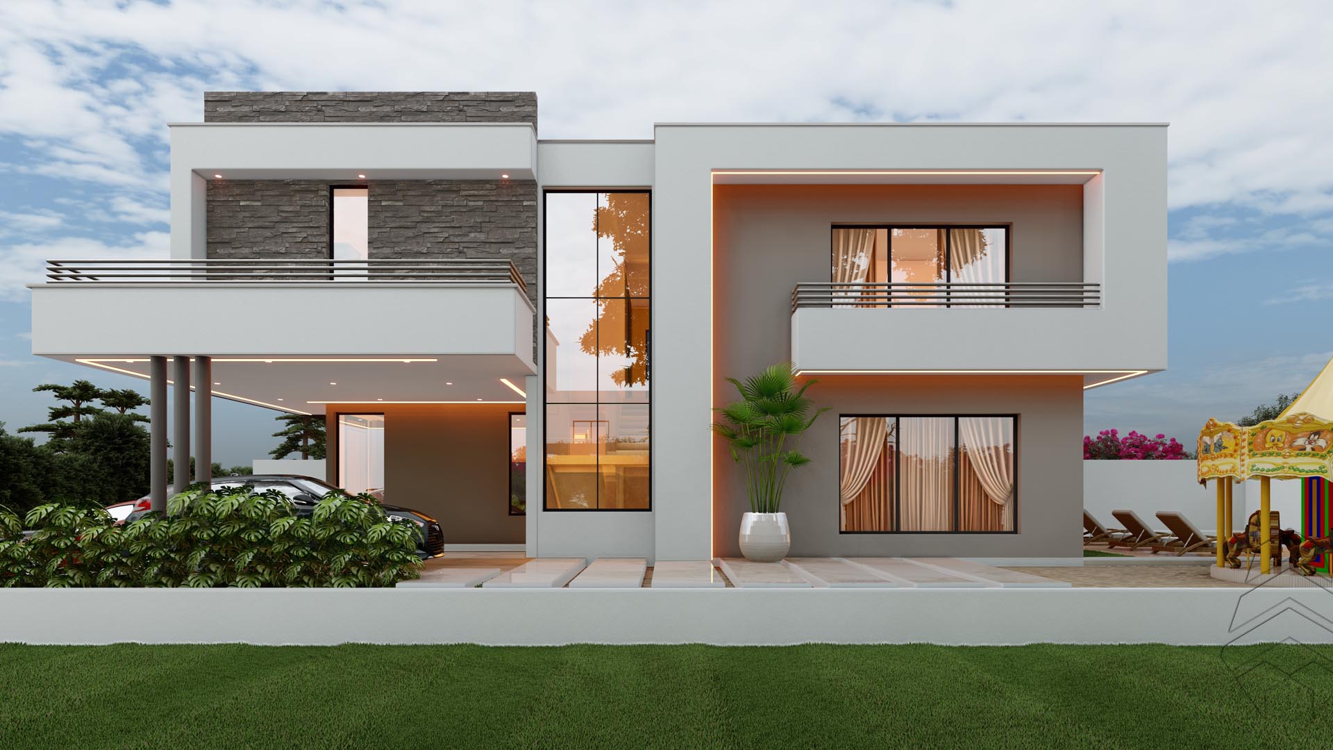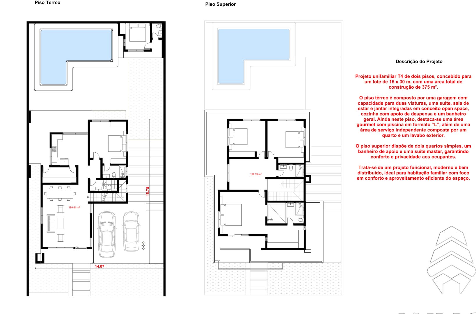 This contemporary Type 4 family residence is designed for a 15 x 30 meter plot, featuring a total built area of 375 m². It combines modern architecture with a practical layout, ideal for comfortable family living. The ground floor includes a double garage, a guest suite, and an open-concept living and dining area seamlessly connected to a kitchen with an adjoining pantry. A general bathroom serves this level, while a dedicated gourmet area with an L-shaped swimming pool creates a perfect space for outdoor gatherings and relaxation. Additionally, an independent service area with a staff room and exterior washroom ensures functionality and convenience. Upstairs, the home offers two standard bedrooms, a shared bathroom, and a luxurious master suite, providing privacy and comfort for the family. Designed with efficiency and style in mind, this home delivers a modern, well-distributed layout that maximizes space while offering elegant living both indoors and outdoors.