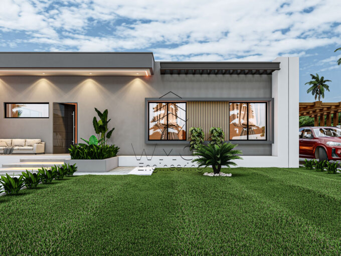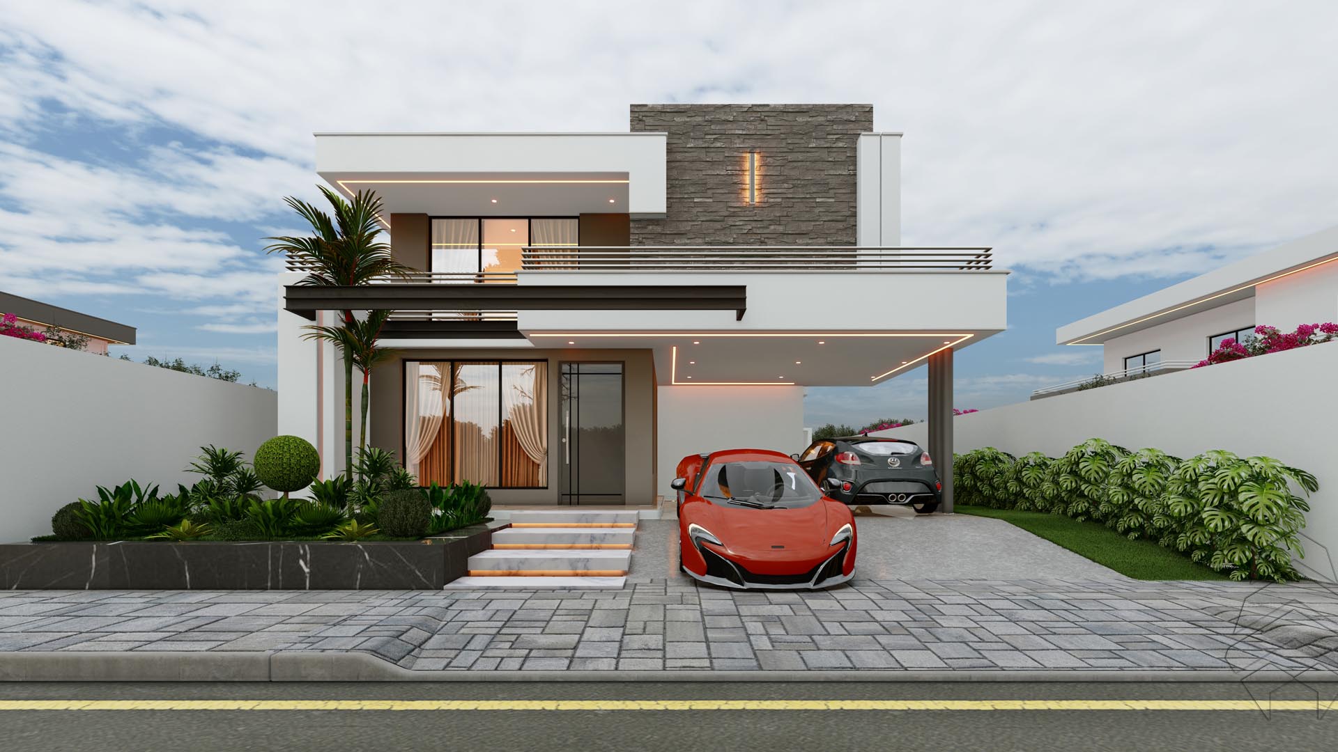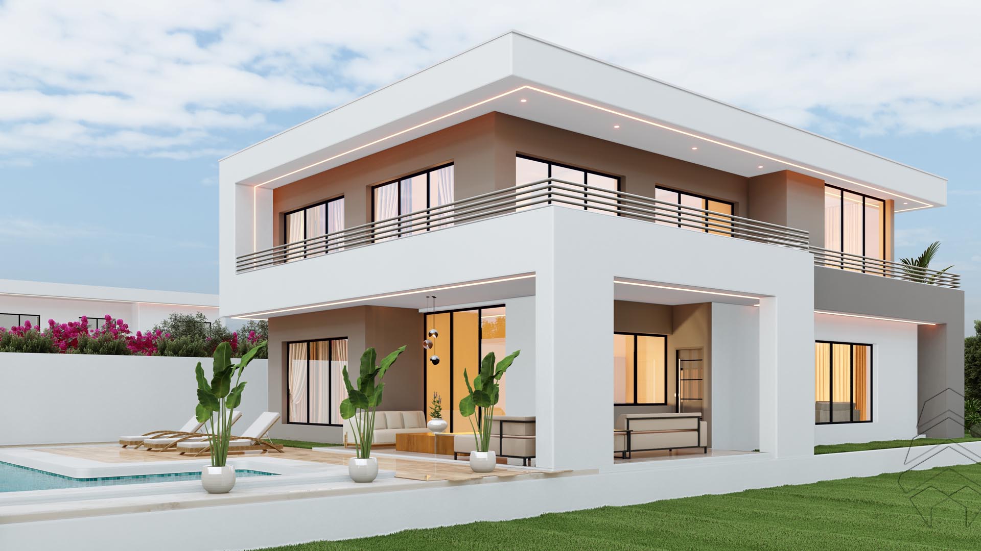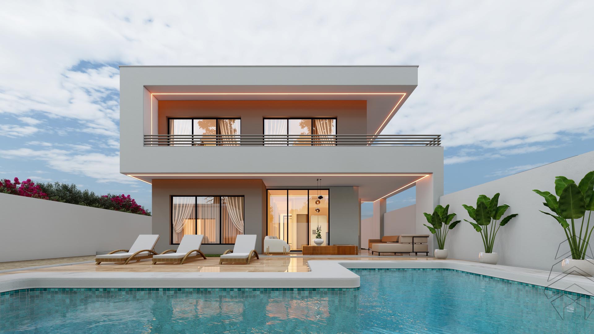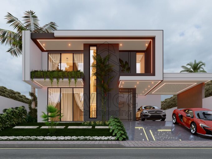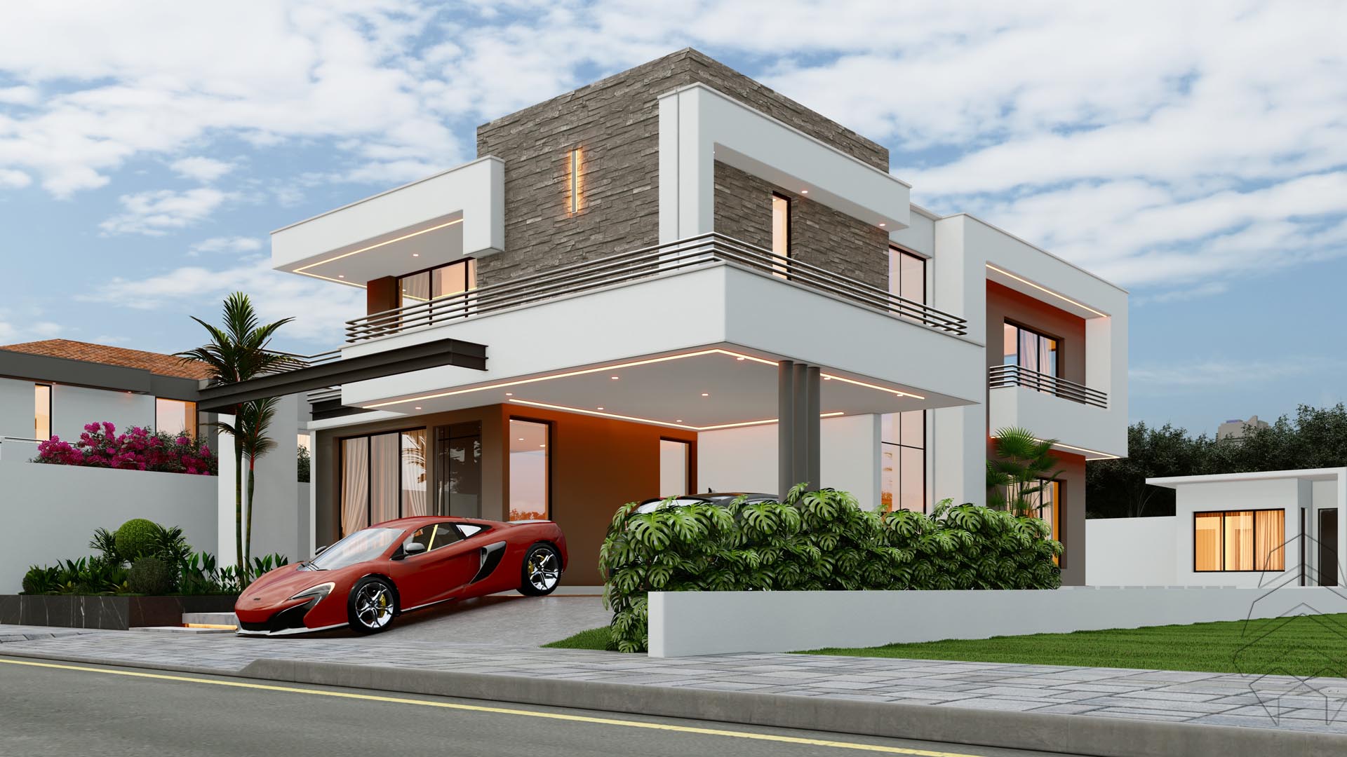 This contemporary Type 4 family residence is designed for a 15 x 30 meter plot, featuring a total built area of 375 m². It combines modern architecture with a practical layout, ideal for comfortable family living. The ground floor includes a double garage, a guest suite, and an open-concept living and dining area seamlessly connected to a kitchen with an adjoining pantry. A general bathroom serves this level, while a dedicated gourmet area with an L-shaped swimming pool creates a perfect space for outdoor gatherings and relaxation. Additionally, an independent service area with a staff room and exterior washroom ensures functionality and convenience. Upstairs, the home offers two standard bedrooms, a shared bathroom, and a luxurious master suite, providing privacy and comfort for the family. Designed with efficiency and style in mind, this home delivers a modern, well-distributed layout that maximizes space while offering elegant living both indoors and outdoors.